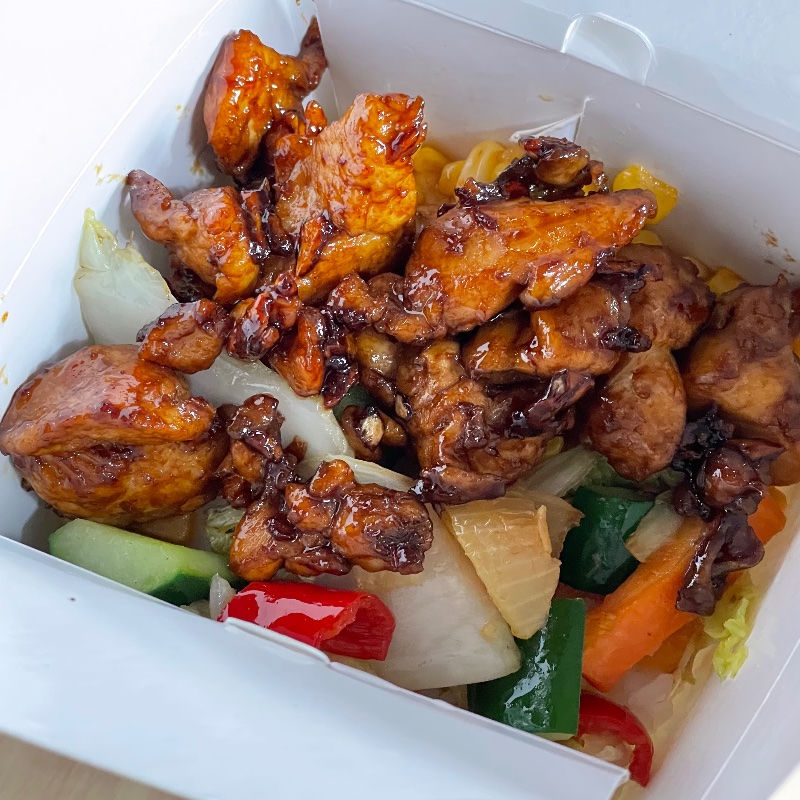 A rice dish with stir-fried mixed vegetables and teriyaki chicken. Presented in a paper box. This main course is only available for weekend or special event's (pre booked packages).