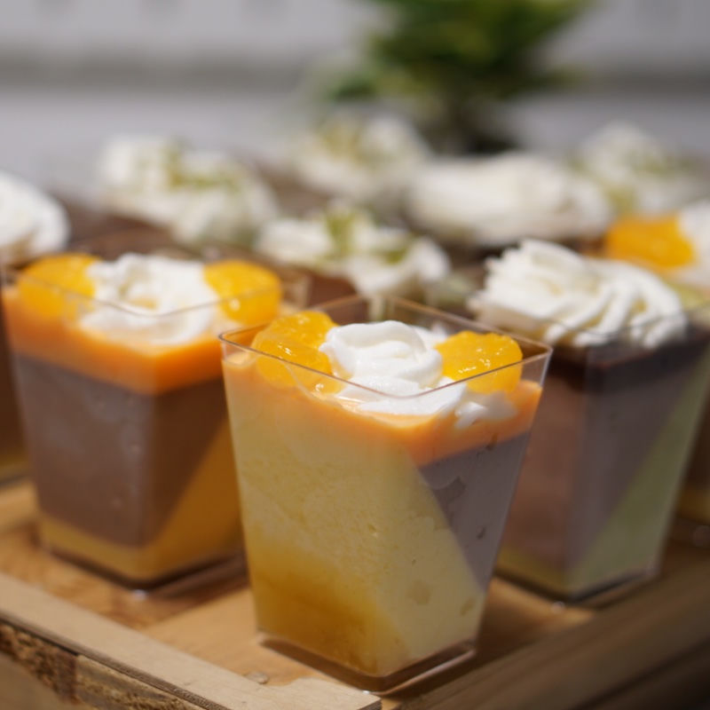 A soft pudding with a variety of fruits flavors, like orange, grapes and mango, completed with smooth cream. Fresh and healthy dessert.